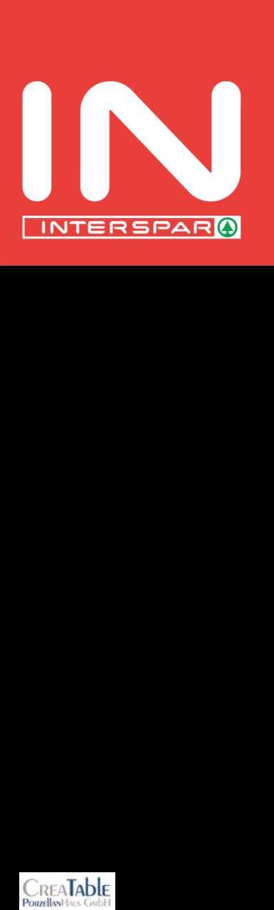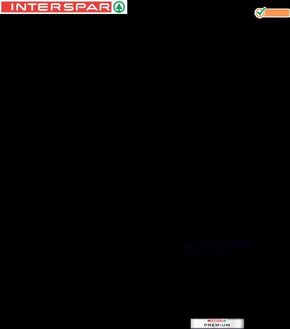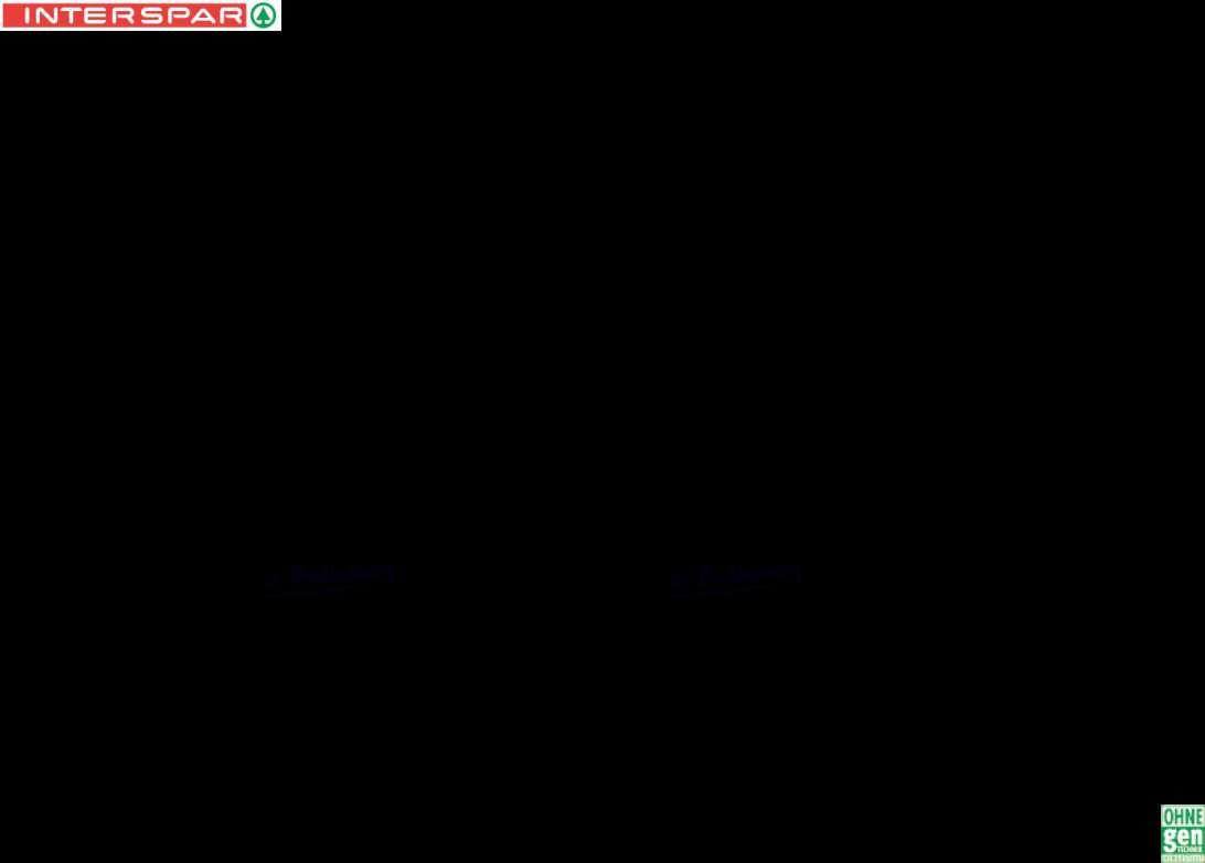 Kundenhotline: 0800/221120 Angebote gültig solange der Vorrat reicht Getränkepreise inkl Steuer exkl Pfand Abgabe in Haushaltsmengen Druck- und Satzfehler vorbehalten Stattpreise sind bisherige INTERSPAR-Verkaufspreise *Stattpreis ist der vom L eferanten/Herstel er unverbindl ch empfohlene Verkaufspreis Wegen des beschränkten Platzangebots s nd sperrige Produkte in den INTERSPARMärkten Wien-Mitte, Wien-Hauptbahnhof, Wien am Schottentor und W en Sand eitengasse nicht lagernd D ese Produkte können Sie an diesen 4 Standorten bestel en Bitte wenden Sie sich an unsere M tarbe ter vor Ort interspar.at Med eninhaber/Herausgeber/Redaktion: INTERSPAR Gesellschaft m b H Europastraße 3 5015 Salzburg; Druck: Walstead Leykam Druck Druck- Verlags- und Herstellungsort: Neudörfl