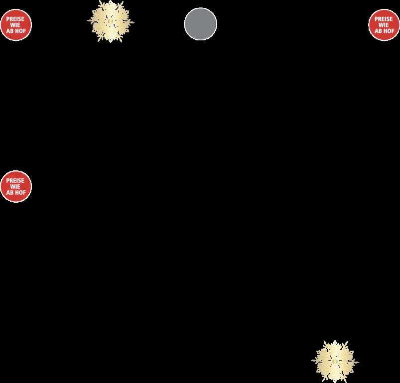 OneTouch CappuccinoFunktion 5 ! Zusätzlich -15% aufdenAktionspreis von Mi,2112 bis Sa,2412. Sa,24 nur38165 ! 1499 Melitta Thermobecher 250 ml Eignet sich dank optimaler Isoliereigenschaften ideal für warme und kalte Getränke Hält 2 bis 3 Tassen (250 ml) für 1 Stunde warm oder Kaltgetränke bis zu 2 Stunden kühl. Ergonomische Formgebung und Anti-Rutsch-Stellfläche, je Alles für Ihren perfekten Kaffee und mehr Auswahl unter nd interspar.at/kaffee Bialetti Thermoflaschen 500 ml Die Bialetti Edelstahl Thermo-Trinkflasche ist doppelwandig sowie vakuumisoliert und hält das Getränk bis zu 24 Stunden lang kalt oder 12 Stunden lang warm. Soft-Touch-Beschichtung, auslaufsicher, BPA-frei, die Öffnung ist groß genug um Eiswürfel einzufüllen, aus Edelstahl, je Zusätzlich -15% aufdenAktionspreis von Mi,21.12. bis Sa,24.12. n Sa,24 nur10115 Bialetti Espressokocher Mokka Express Für den italienischen Kaffeegenuss Geeignet für alle Herdarten außer Induktion. In 2 Ausführungen: • Espressokocher 6 Tassen statt 36,90 nur 32,90 2499 statt 28 99 Sie sparen 4,-! 3 Tassen Zusätzlich -15% aufdenAktionspreis von Mi,21.12. bis Sa,24.12. Sa,24 nur2124 ALLES DA DA DA Zusätzlich -15% aufdenAktionspreis von Mi,21.12. bis Sa,24.12. k Sa,24. nur15215 Siesparen77,84! 68 x in Österreich 5 x in Vorarlberg • BREGENZ-VORKLOSTER, Heldendankstraße 22, gratis • DORNBIRN-MESSEPARK, gratis • FELDKIRCH-ALTENSTADT, Königshofstraße 79, gratis • FELDKIRCH-ILLPARK, gratis • BLUDENZ-BÜRS ZIMBAPARK, Almteilweg 1, gratis P P P P P interspar.at weinwelt.at interspar.at/restaurant interspar interspar