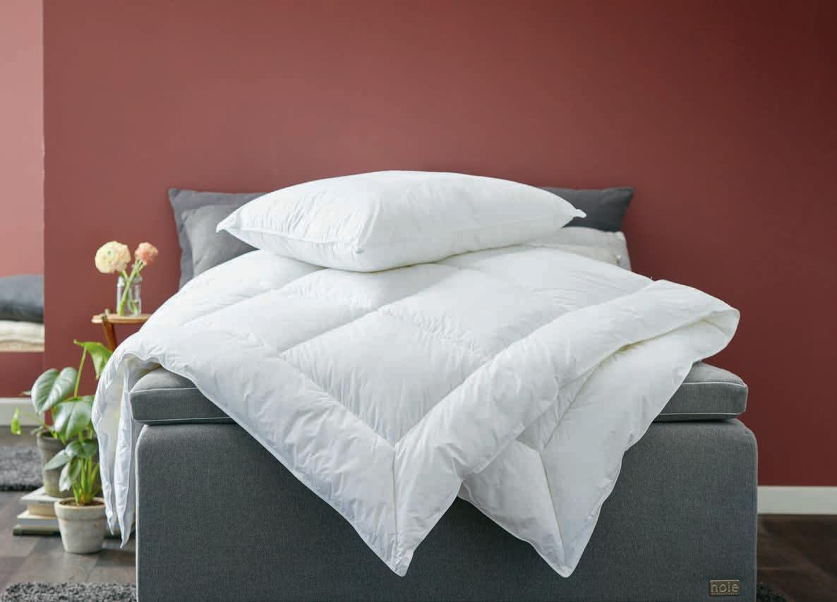 Qualitätsbettdecke mit 60% weißen Entendaunen/40% Entenfedern, 900 g. Weiche Hülle aus Batist (100% Baumwolle). Füllkraft 400. Waschbar bei 60°C. 135x200 cm 129,-