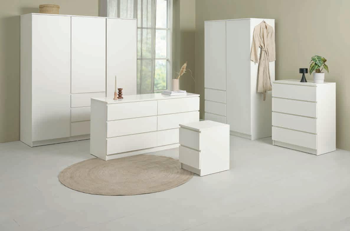 1) Kleiderschrank LIMFJORDEN Dekorfolie. Schrankaufteilung: 4 Einlegeböden und 2 Kleiderstangen. B180 x H200 x T58 cm** 2) Kleiderschrank LIMFJORDEN Dekorfolie. Schrankaufteilung: 4 Einlegeböden und 1 Kleiderstange. B120 x H200 x T58 cm** 3) Kommode LIMFJORDEN Dekorfolie. B161 x H79 x T48 cm 4) Kommode LIMFJORDEN Dekorfolie. B81 x H101 x T48 cm 5) Nachttisch LIMFJORDEN Dekorfolie. B41 x H56 x T48 cm