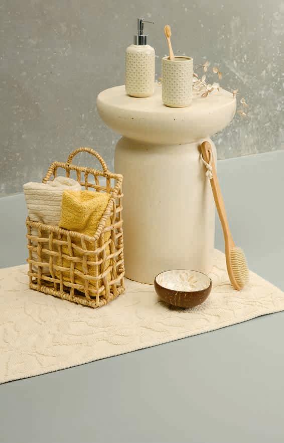 1) Badematte ALMVIK 100% Baumwolle. 50x80 cm 18,99 2) Handtuch SVANVIK 100% Baumwolle. In verschiedenen Farben erhältlich. 420 g/m². 50x90 cm 3) Korb HAGUDA Wasserhyazinthe, Stahl. B22 x L12 x H35 cm 4) Seifenspender BOTSMARK Irdengut und Kunststoffe. Ø7 x H19 cm 6,49 5) Zahnbürstenhalter BOTSMARK 4,99 6) Deko-Schale BLEKET Kokosnuss. Ø14 x H6 cm
