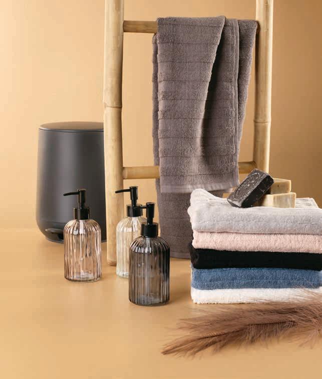 1) TRETEIMER OXIE Kunststoff und Stahl. Mit Soft-Close-Funktion. 5 Liter. Ø23 x H28 cm 2) SEIFENSPENDER ROSENLUND ABS-Kunststoff und Glas. In verschiedenen Farben erhältlich. Ø7 x H19 cm 3) HANDTUCH TORSBY 100% Baumwolle. Weich und sehr saugfähig. 515 g/m². 50x90 cm