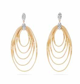 Bei diesen Hängeohrringen sind fünf Ovale aus einer gedrehten Spirale, die mit der Coil-Technik gefertigt sind, durch eine Öse mit Diamantpavé im Brillantschliff miteinander verbunden. Die absichtlich unregelmäßige Form der Ellipsen verleiht besondere Raffinesse.