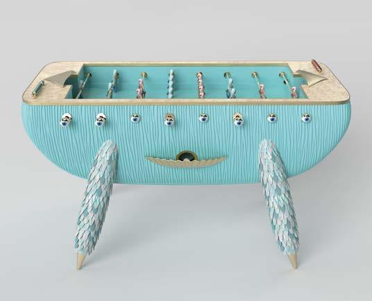 Mit dem Babyfoot Campana aus der Louis Vuitton Home Collection hebt das brasilianische Estúdio Campana den guten alten Kickertisch auf ein neues Niveau – surrealistisch, verspielt und extravagant. Inspiriert von der Unterwasserwelt tummeln sich anstelle gewöhnlicher Spielfiguren fantasievolle Meerjungfrauen auf dem Spielfeld. Handwerklich makellos, mit Wellengang und einem Augenzwinkern inszeniert, avanciert der „Wuzzler“ zum extravaganten Kunstobjekt –ein Stück High-End-Design, das Humor und Luxus gekonnt verbindet. So stilvoll hat noch niemand „Tor!“ gerufen. • de.louisvuitton.com