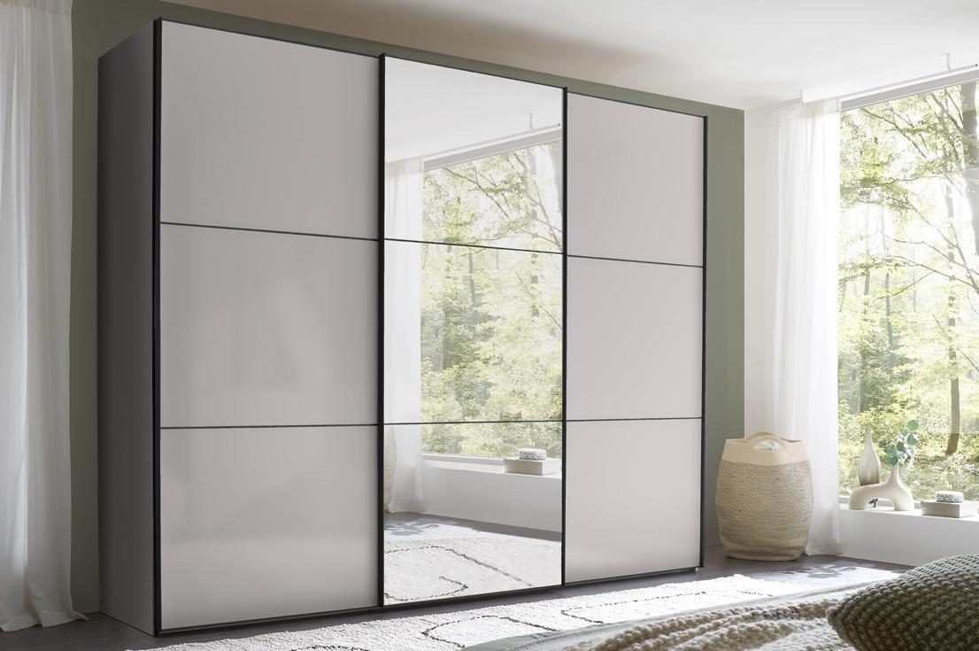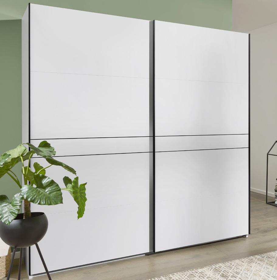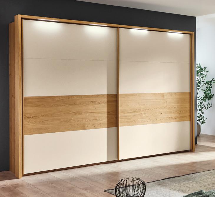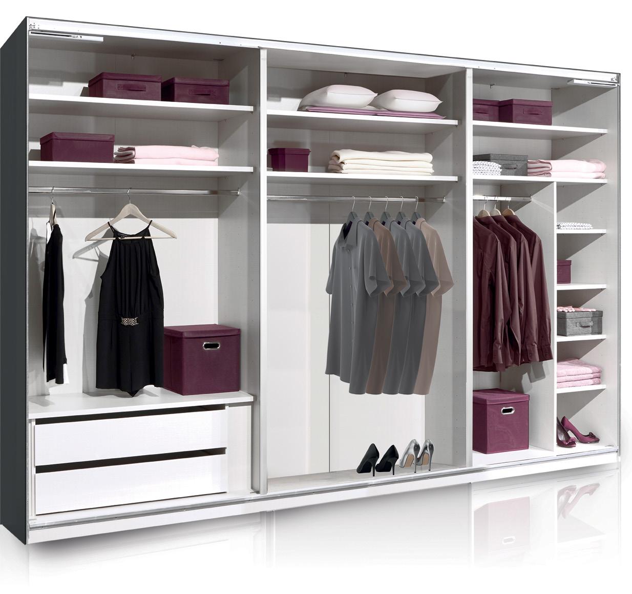Fix und fertig zum Einräumen – Schwebetürenschränke mit hochwertiger Innenausstattung in Dekor Texline. 2- oder 3-türig. Serienmäßig mit einer enorm praktischen T-Einteilung und einem Schubkasteneinsatz mit 2 Schubkästen (mit Softeinzug). Geschmeidiger Lauf der Schwebetüren durch ein integriertes Schließdämpferset komfortabel gedämpt.