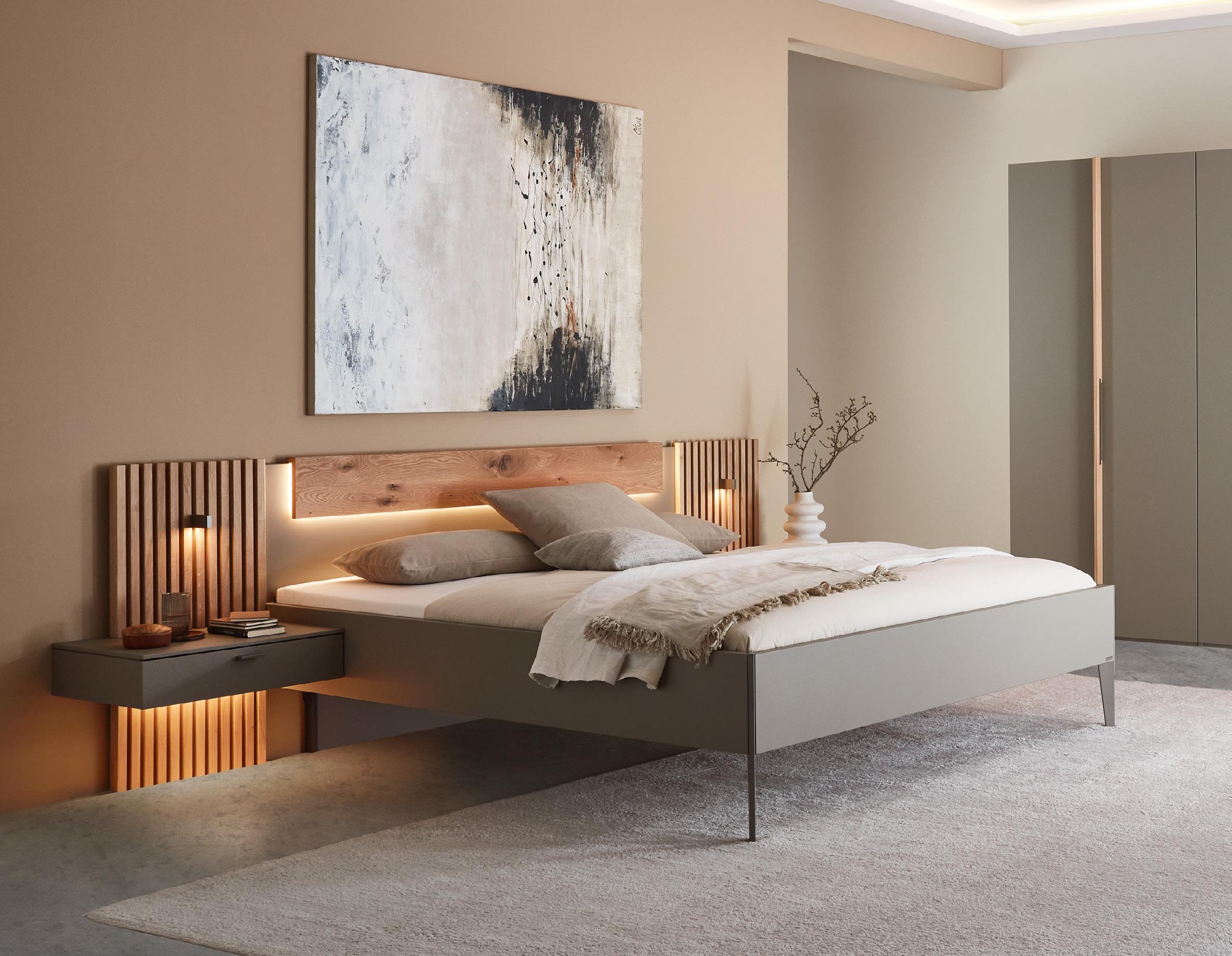 Komfort-Liegenbett in Lack fango mit Bettkopfteil-Aufsatz in Wildeiche massiv, Liegefläche ca. 180x200 cm 1099,- kombiniert mit Hängekonsole links und rechts je 299,- Konsolenpaneel-Set mit Lamellen in Wildeiche links und rechts je 519,- Kopfteilbeleuchtung 149,LED-Spot Beleuchtung 69,- Bettschubkästen links und rechts 939,Kleiderschrank 6-türig in Lack fango mit Holzgriffleiste in Wildeiche massiv 3289,- LED Aufsatzleuchte 2er Set 399,-