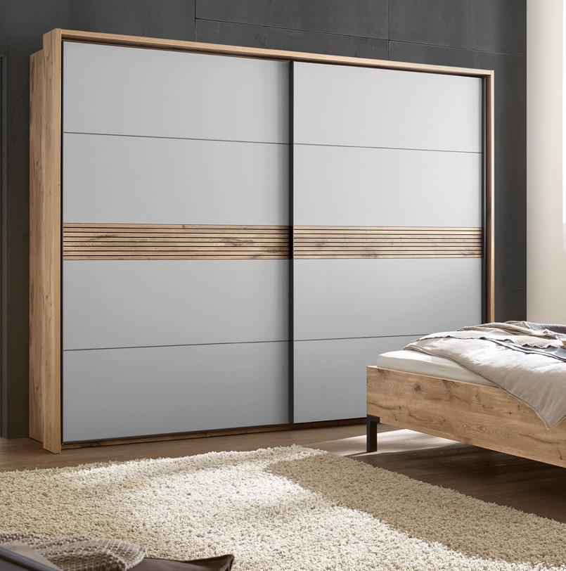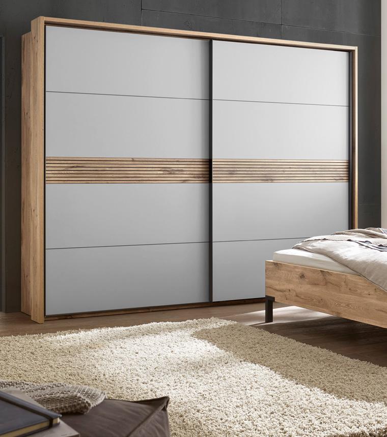 Schwebetürenschrank, 2-trg., Front Lack Sand/ Wildeiche furniert, inklusive Passepartout, ca. B301/H230/T68 cm.