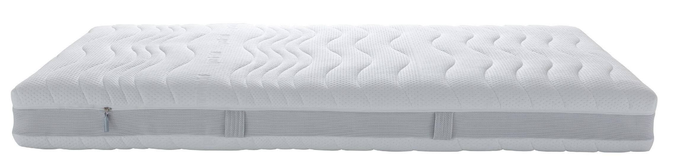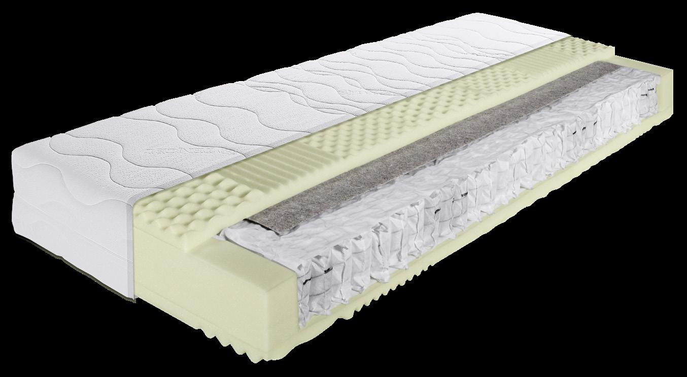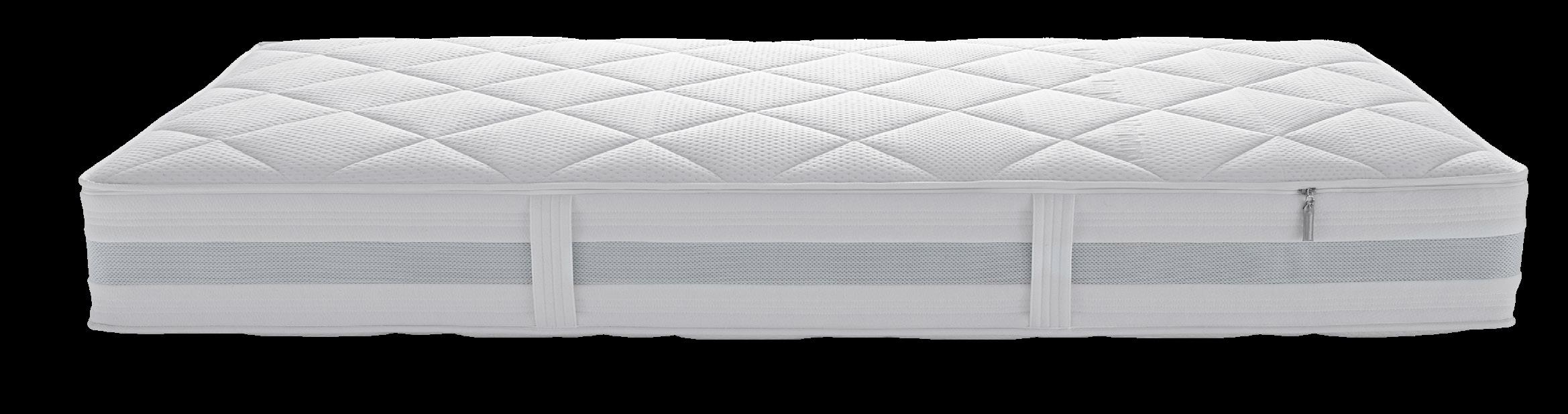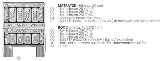 Die Krönung: die 26 cm hohe Matratze (BF 10) mit voluminösem Oberblatt und tiefgezogenen Nähten. Diese 7-Zonen-Taschenfederkernmatratze bietet zudem mit der integrierten Latexauflage ein angenehmes, weiches Liegegefühl und sorgt für hervorragenden Schlafkomfort.