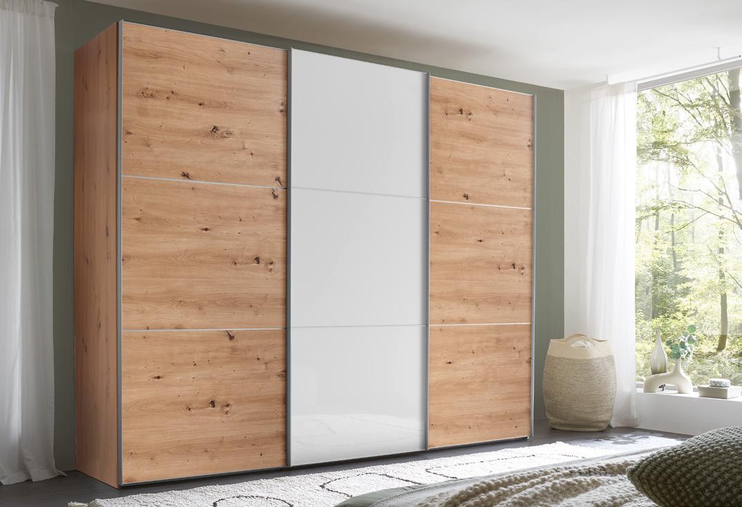 Kombinationsbeispiel: Schwebetürenschrank, 3-trg., Korpus und Außentüren Dekor Artisan Eiche, Mitteltür Hochglanz weiß. Griff-/Zierleisten alufarbig.