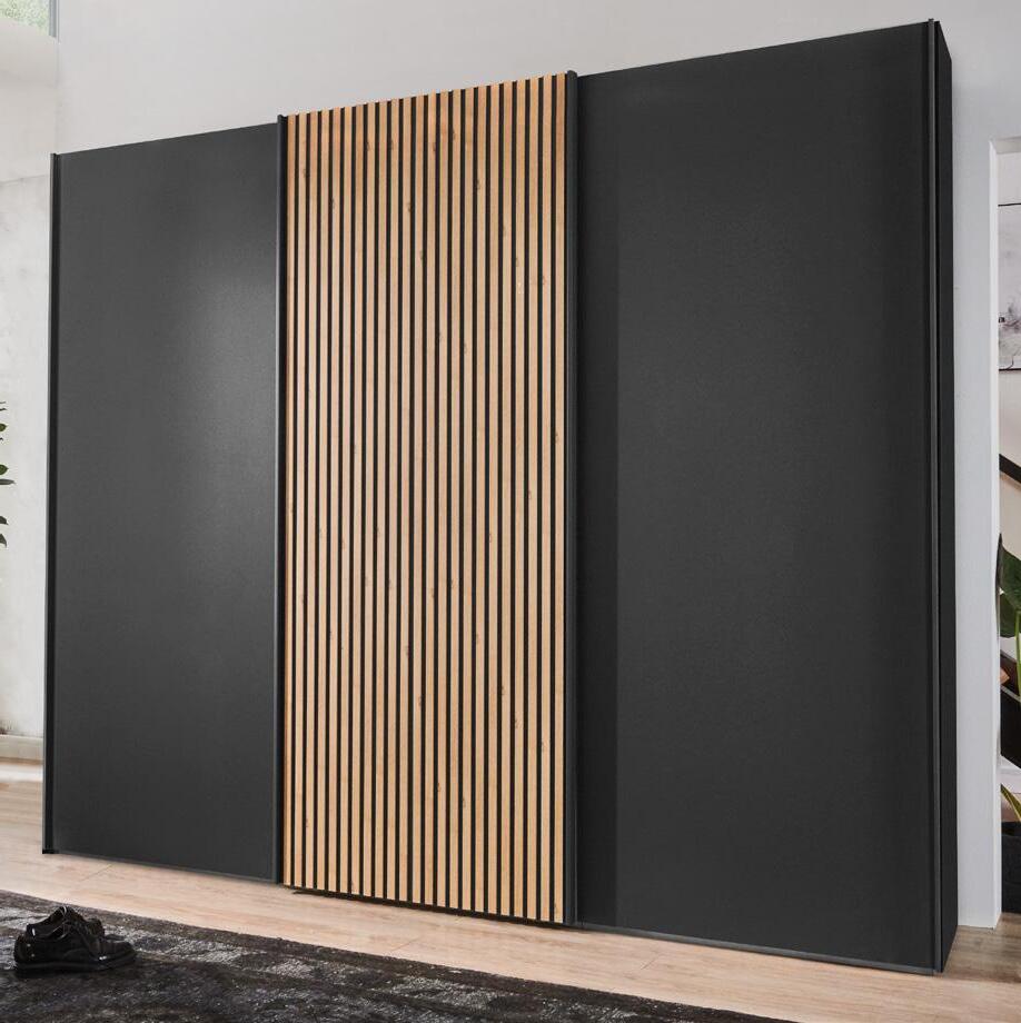 Schwebetürenschrank, 3-türig, Front und Korpus graphit, mittlere Tür mit Lamellen in Bianco Eiche Nachbildung, ca. B300/H217/ T67 cm.