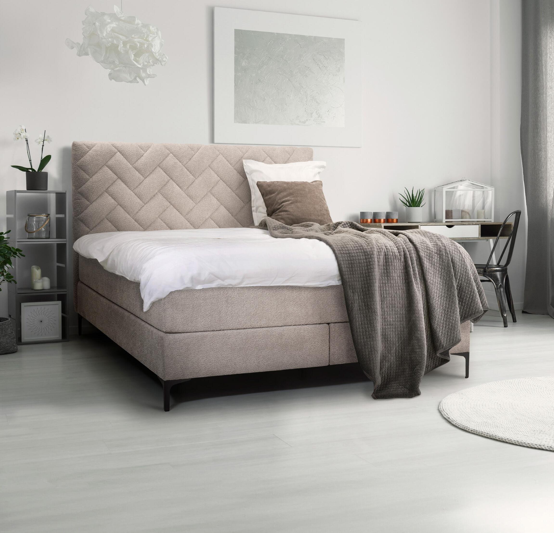 Boxspringbett mit Federkern , Bezug Stoff, Fuß Metall schwarz, Matratze mit Bonellfederkern und Vliesabdeckung, stoffbezogener Matratzenbezug an Seitenteilen, Topper mit 5 cm Weichschaumkern, mit 4-seitigem Zipp abnehmbar und waschbar, Liegefläche ca. 180x200 cm. Ohne Nachtkonsole, Bettzeug, Kissen, Plaid und Deko.