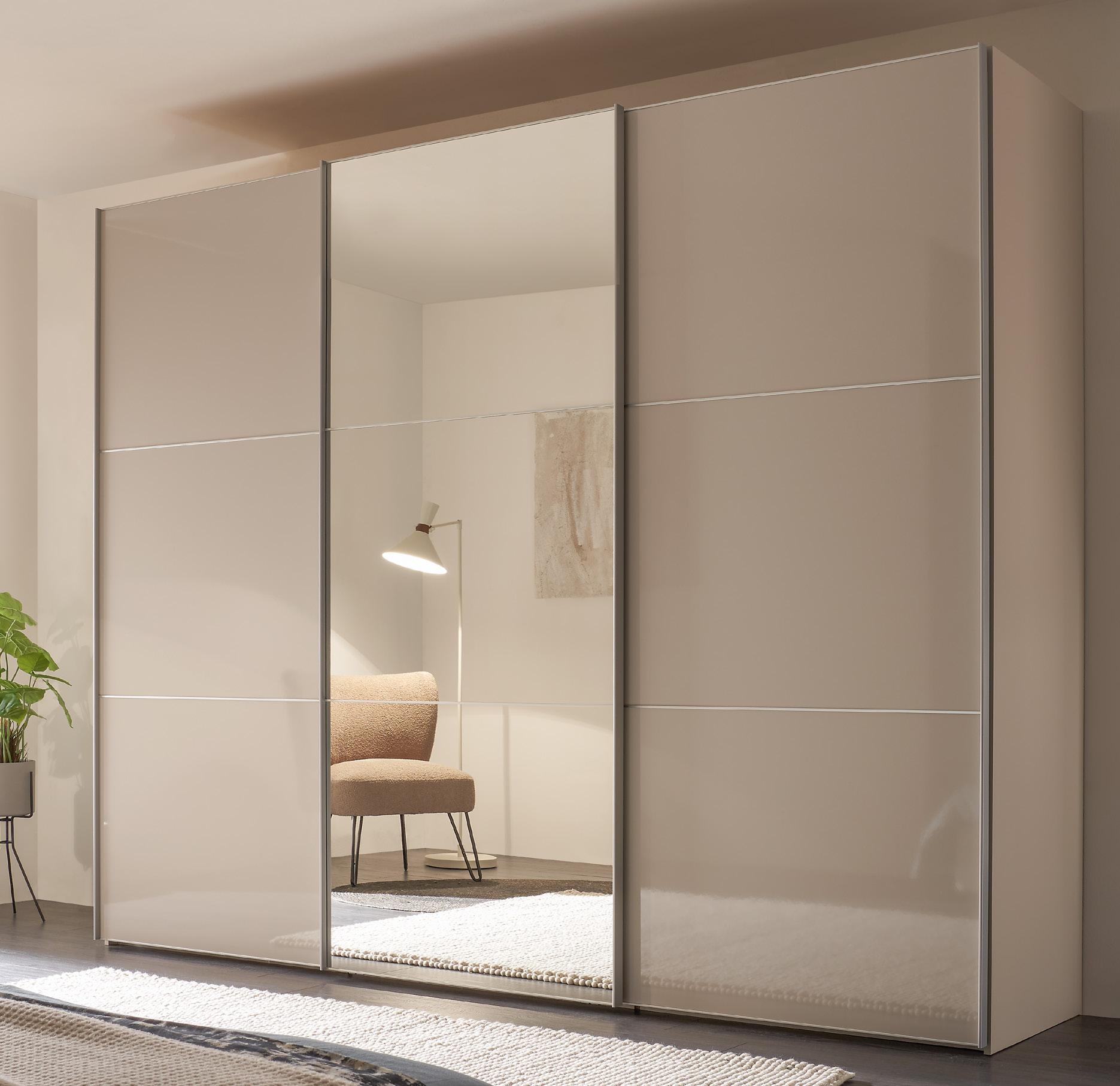 Schwebetürenschrank, 3-trg., Korpus Dekor Sand, Außentüren Hochglanz Sand, Mitteltür Kristallspiegel, Griffe und Zierleisten alufarbig, ca. B298/H222/T68 cm.