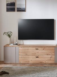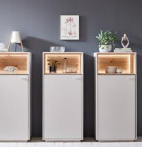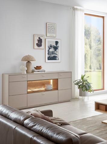 Wohn- und Speisezimmerprogramm, Front und Korpus kaschmir Melamin, Absetzung Eiche Artisan Nachbildung. Diese Möbel enthalten eingebaute LED-Lampen. Die Lampen können in der Leuchte nicht ausgetauscht werden.