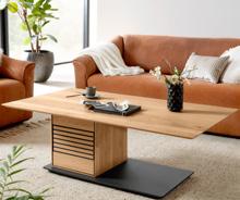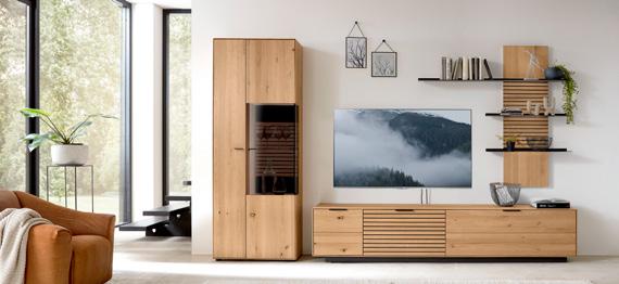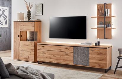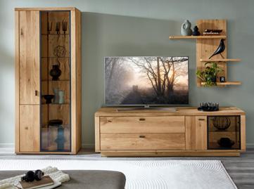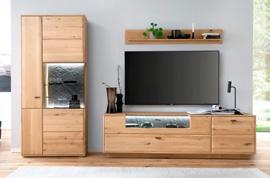 Wohnprogramm , Front und Korpus Ast/Balkeneiche massiv, durchgehende Lamelle Kristalleiche geölt, sichtbare Rückwände Stein Veneer Alpin, Griff Metall anthrazit. Diese Möbel enthalten eingebaute LED-Lampen. Die Lampen können in der Leuchte nicht ausgetauscht werden. 10. Kombi-Vitrine inkl. LED-Beleuchtung, ca. B94/H207/T37 cm. 1499,11. LowBoard inkl. LED-Beleuchtung, ca. B214/H63/T50 cm. 1199,12. WANDBOARD, ca. B150/H22/T22 cm. 219,13. Sideboard, 3 Türen, 1 Schub, ca. B184/H90/T44 cm. 1299,14. Couchtisch, ca. B110/H45/T65 cm. 549,-