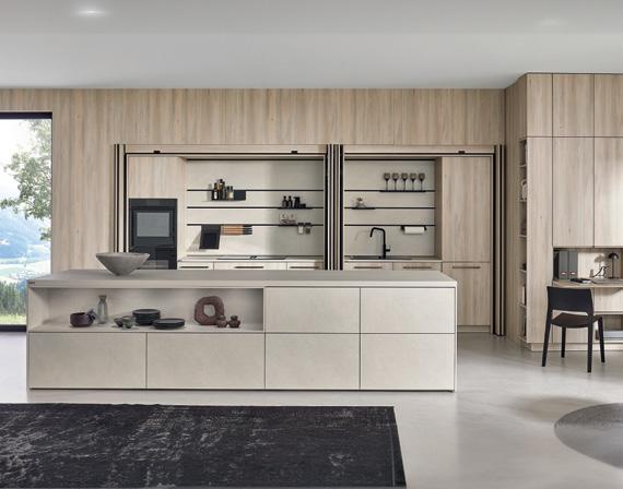 Über 120 attraktive Griffvarianten stehen zur Wahl. Der geräumige Hochschrank beherbergt hinter Einschubtüren eine superpraktische Funktionszeile.