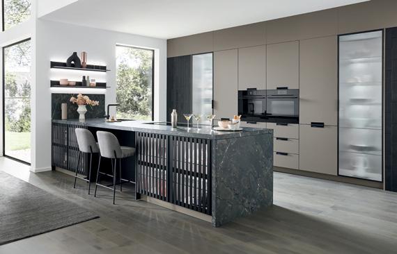 Auch die großzügige Kücheninsel übernimmt das schicke Lamellendesign und dient als Mittelpunkt moderner Gastlichkeit.