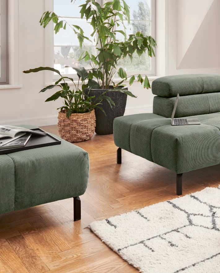 ECKKOMBINATION, Bezug Stoff Feincord lind, Metallfuß schwarz, best. aus: 1,5-Sitzer Kombielement mit Anstellhocker links und 3-Sitzer mit Armteil rechts. Stellmaß ca. 224x301 cm Bezug: 95% Polyester, 5% Nylon 489243