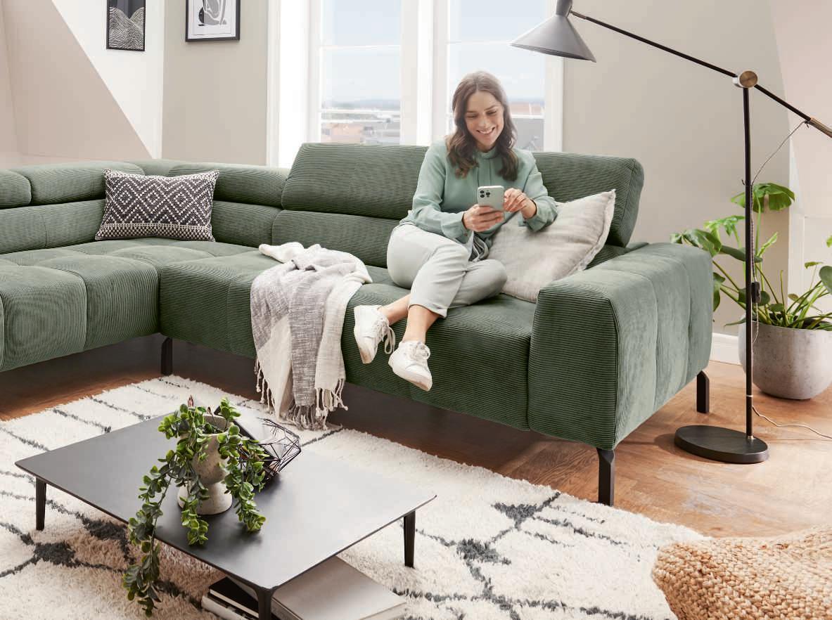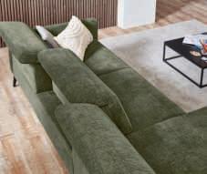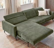 ECKKOMBINATION, Bezug Stoff Feincord oliv, Metallfuß schwarz matt, best. aus: Umbauecke links und 2-Sitzer mit Armteil rechts, inkl. Kopfteilverstellung an allen Elementen, Stellmaß ca. 219x276 cm. Bezug: 95% Polyester, 5% Nylon 196115