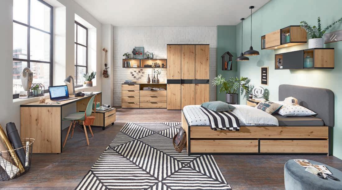 DAS FLEXIBLE KINDER- UND JUGENDZIMMER – Ein Modell, jede Menge Möglichkeiten. Ob Jugendzi mmer, Studentenwohnung oder Appartement – mit diesem flexiblen Zimmer finden Sie immer die passende Antwort auf sich ändernde Wohnansprüche und Wohnverhältnisse. Wählen Sie zeitgemäße Auswahlmöglichkeiten für Dekore, Kontrastkanten, Akzentausführungen, Griffe, Standfüße und Polsterstoffe So stimmen Sie Ihre neuen Möbel nach Lust und Laune auf Ihre Einrichtung und Ihren individuellen Geschmack ab. made in Germany