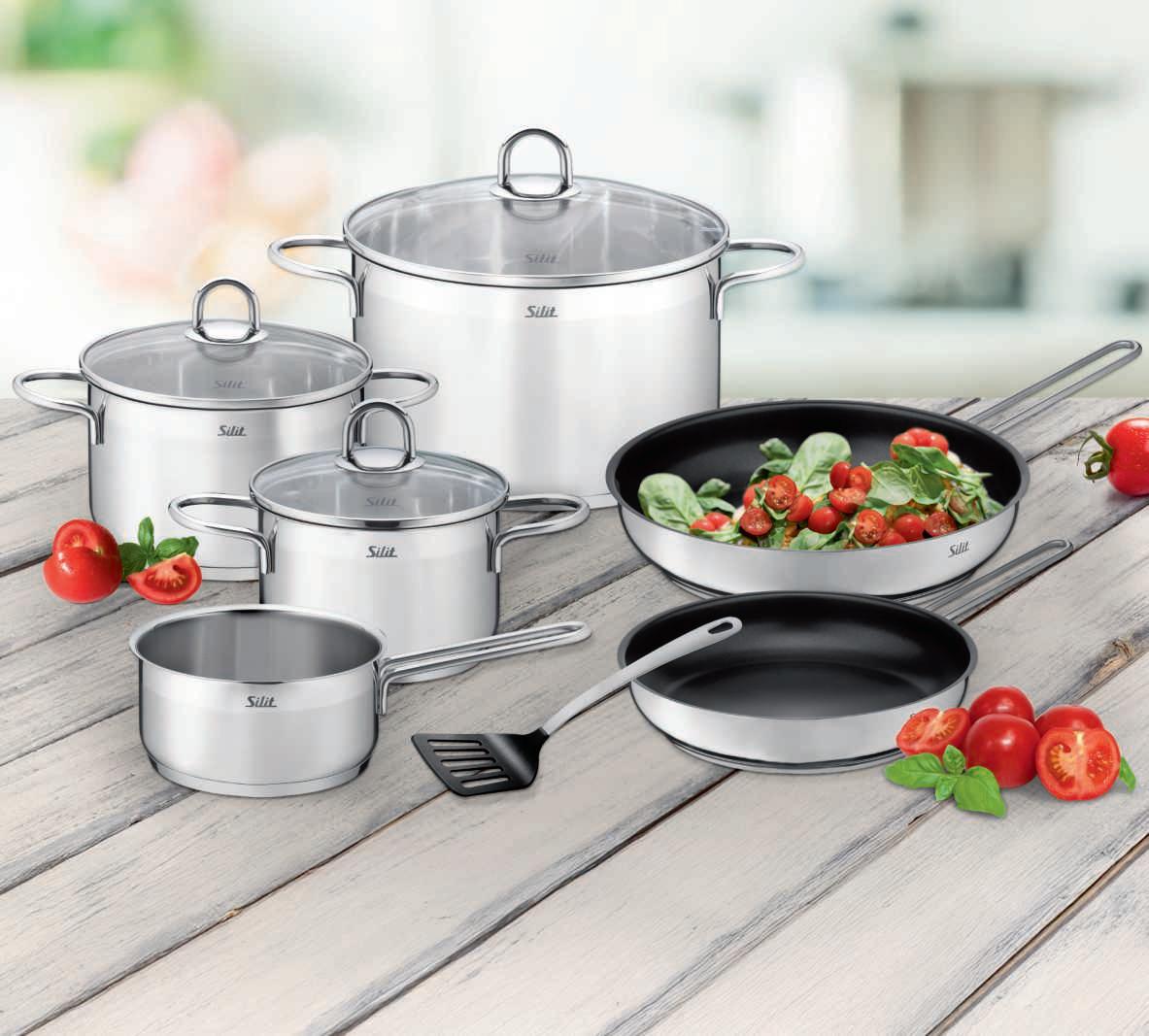 7-TLG. STARTER-SET, Edelstahl rostfrei 18/10, SilitTherm® Allherdboden, für alle Herdarten geeignet, spülmaschinenfest, breiter Schüttrand, best. aus: je 1x Kochtopf mit Deckel, Ø ca. 16, 20 und 24 cm, 1x Stielkasserolle ohne Deckel, Ø ca. 16 cm, je 1x Stielpfanne, antihaftbeschichtet, Ø ca. 24 und 28 cm, 1x Pfannenwender. 126080 734019