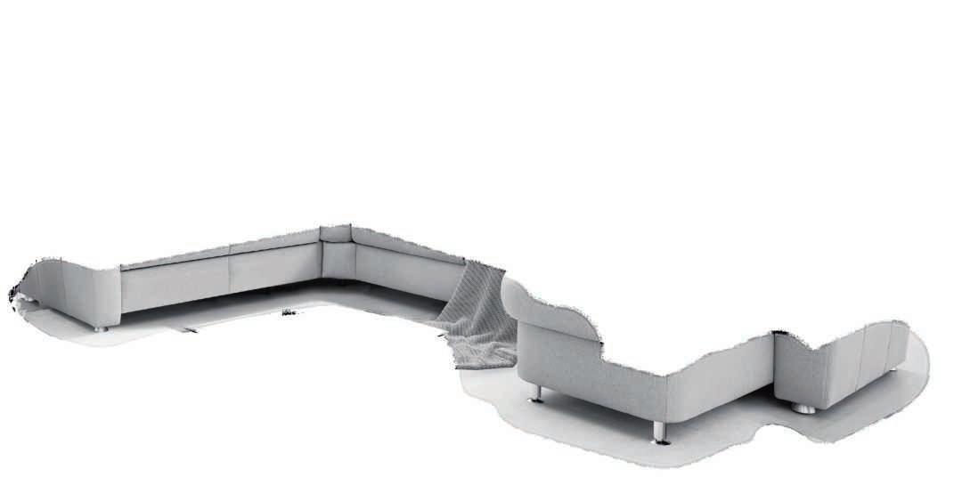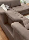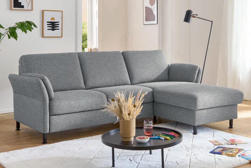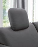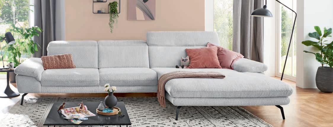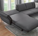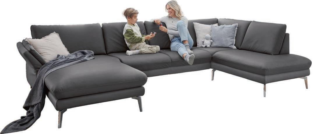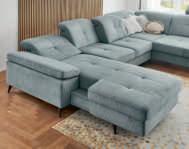 Bezug Stoff Cyber steel, Metallfuß schwarz, best. aus: Canapé mit Armteil links, 2,5-Sitzer inkl. Sitztiefenverstellung, Spitzecke, 1,5-Sitzer inkl. Sitztiefenverstellung und Anstellhocker rechts, Stellmaß ca. 198x353x255 cm.