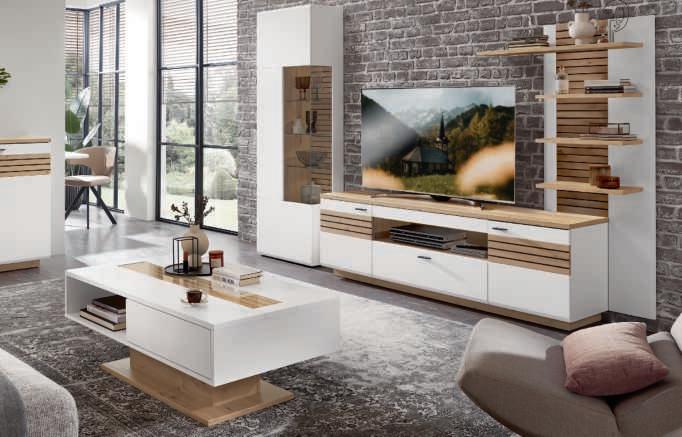 WOHNWAND, Front und Korpus weiß matt, Absetzung Artisan Eiche Nachbildung, Leistenoptik in Front und Rückwand, Parsolglas, best. aus Vitrine, Lowboard und Wandpaneel, ca. B296/H201/T47 cm. H71025