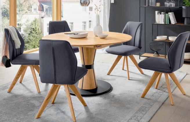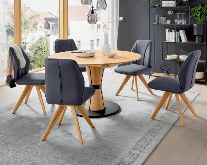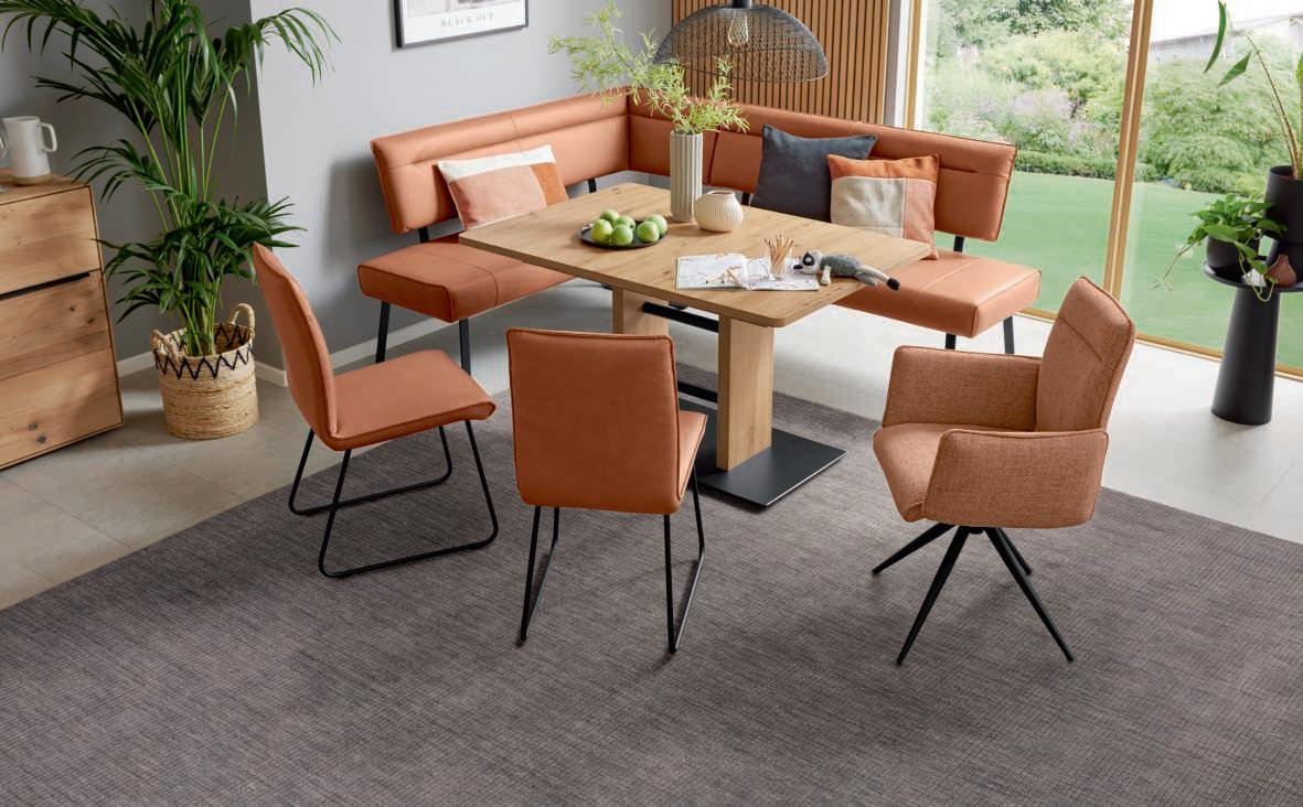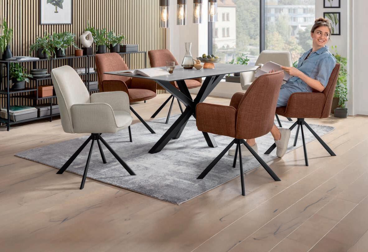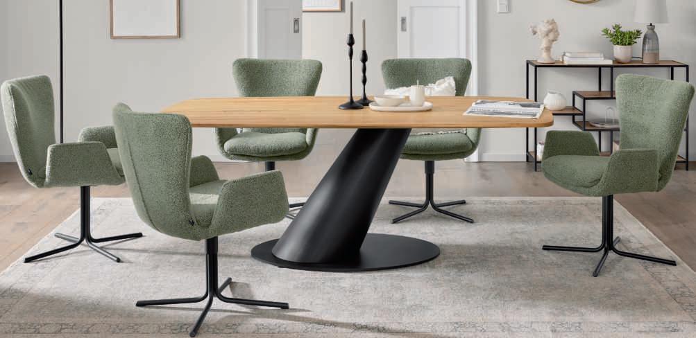 Interliving Esszimmer Serie 5121 - 4I Design-Esstisch, Charakter-Eiche massiv geölt, Plattenformat mit Soft-Ecken, konische Säule auf ovaler Bodenplatte, Metall schwarz, ca. 200x100 cm. 5| Design-Armlehnenstuhl, Bezug Stoff Alpine thyme, asymmetrisches Grafikgestell, Stahl schwarz lackiert, 360° drehbar mit Rückholfunktion, Bezug: 100% Polyester. i26020 6I Interliving Esszimmer Serie 5505 - Esstisch, Artisaneiche Nachbildung, Bodenplatte Metall schwarz Struktur, mit Ansteckplatte ca. 48 cm erweiterbar, ca. 130-178x90 cm. Interliving Esszimmer Serie 5505, 7I Eckbank und 8I Polsterstühle, Bezug Mikrofaser lightbrown, Gestell Kufe Metall schwarz Struktur. Bezug: 100% Polyester. Ohne Zierkissen. 9I Polstersessel, Bezug Stoff caramel, Stativgestell Metall schwarz Struktur, drehbar mit Rückholfunktion. Bezug: 100% Polyester. H64010