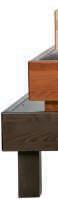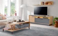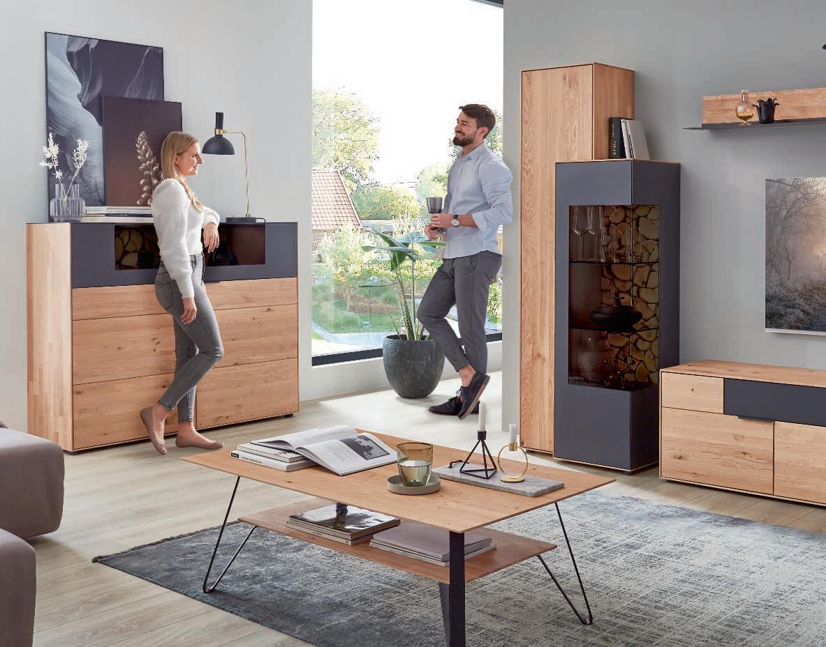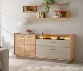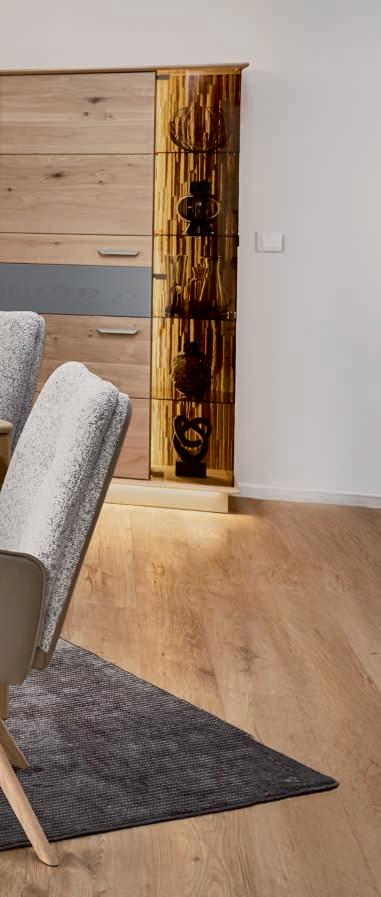 WOHN- UND SPEISEZIMMERPROGRAMM, Eiche massiv, satin gebeizt, matt lackiert, Absetzung und Sockel Lack clay. Diese Möbel enthalten eingebaute LED-Lampen. Die Lampen können in der Leuchte nicht ausgetauscht werden.