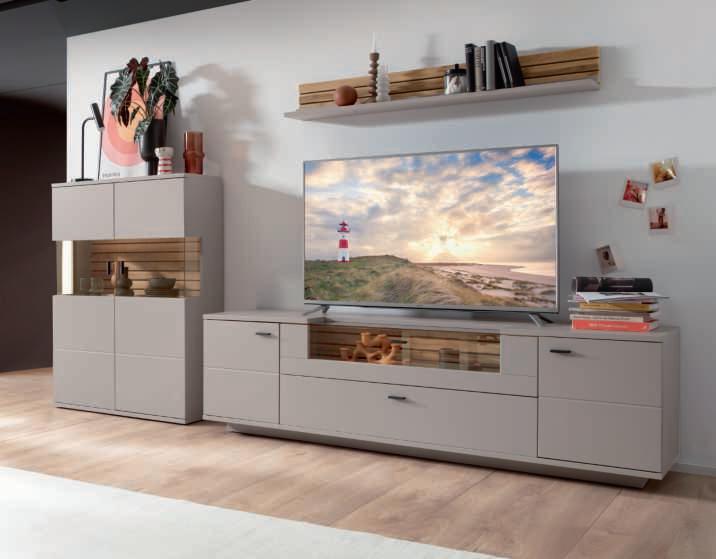 WOHNKOMBINATION, 3-teilig, best. aus Vitrine, TV-Unterteil und Wandboard, ca. B320/H177/T50 cm. 192423/424/425/427