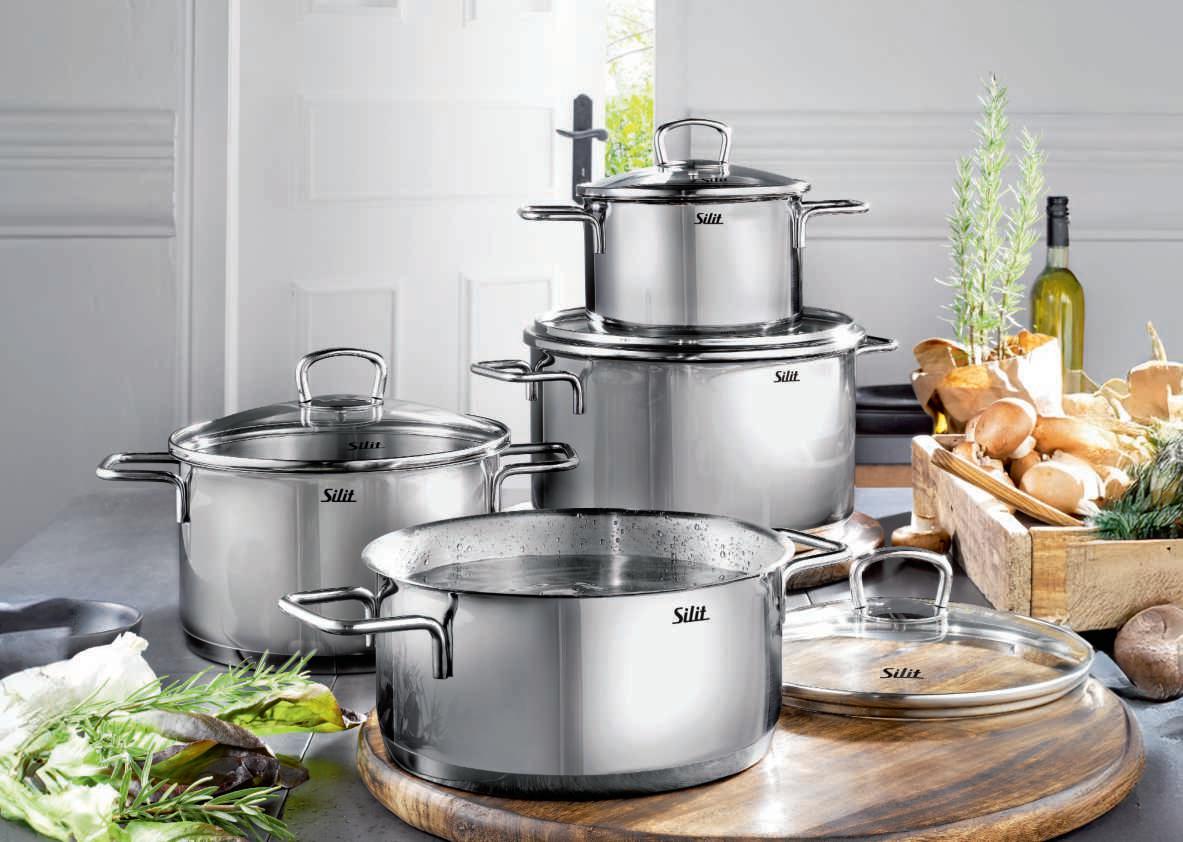 Edelstahl 18/10 rostfrei poliert, SilitTherm® Allherdboden, spülmaschinengeeignet, breiter Schüttrand, hitzebeständig bis 250°C ohne Deckel, bzw. 180°C mit Deckel, für alle Herdarten geeignet, best. aus: Bratentopf Ø ca. 20 cm, Fleischtopf Ø ca. 16 cm, 20 cm und 24 cm. Alicante 126019 734019 239 000 100