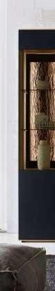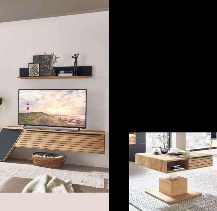 Balkeneiche, massiv, stark gebürstet Carbonfarbig strukturgepulvert Hängeregal, ca B163/H40/T24 cm Sideboard, ca B147/H94/T41 cm Couchtisch, ca B125/H43/T75 cm Vitrine, ca B77/H177/T41 cmWohnprogramm, Front und Korpus Asteiche massiv bianco, geölt und gebürstet, Akzentglas anthrazit, Parsolglas grau, Griffe Metall schwarz lackiert