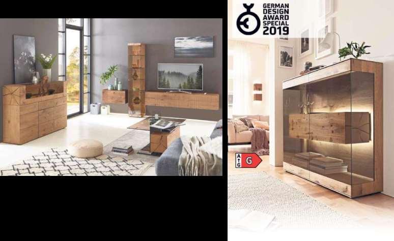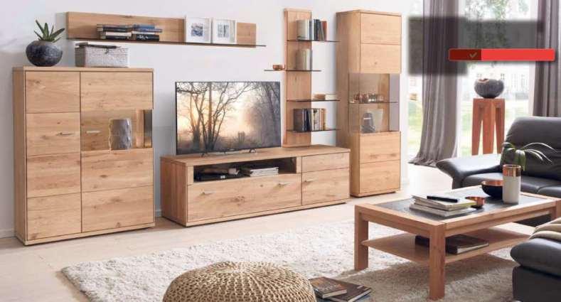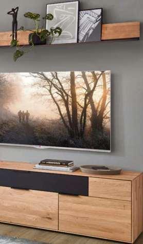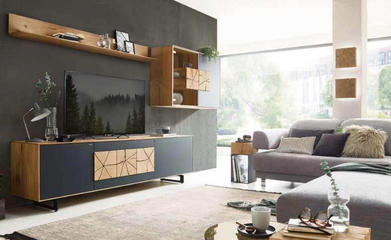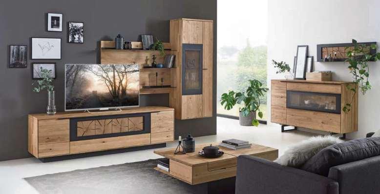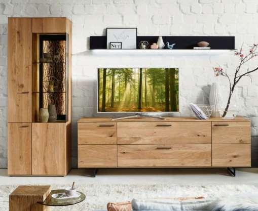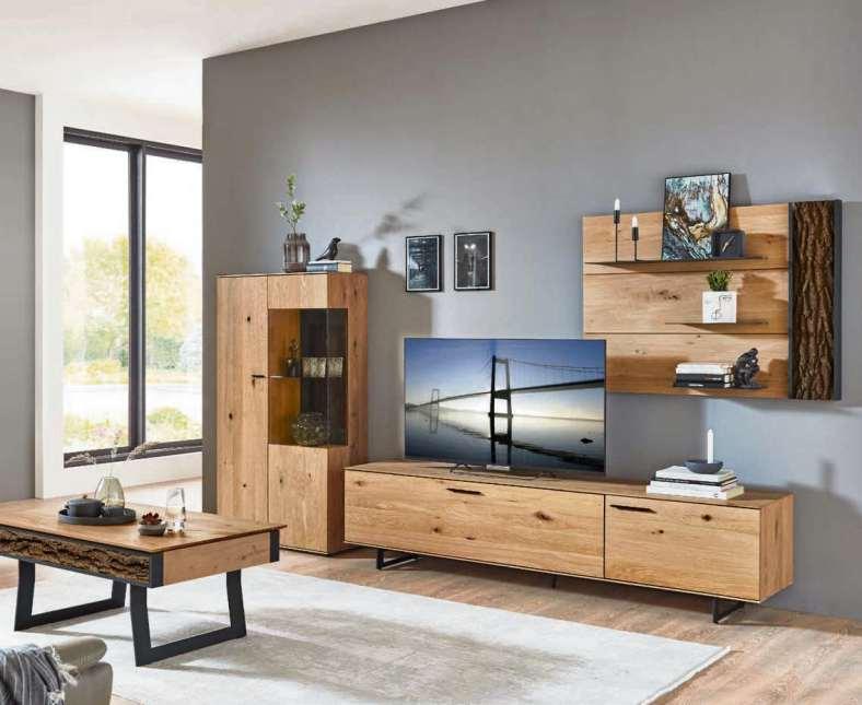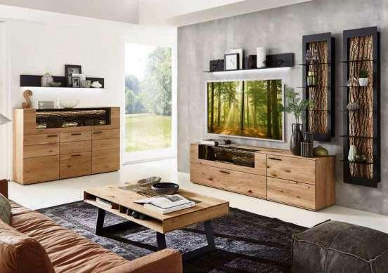 Wohnprogramm, Wildeiche massiv soft gebürstet, Rückwände Kaminholz-Akzent, Absetzung Metall carbonfarbig