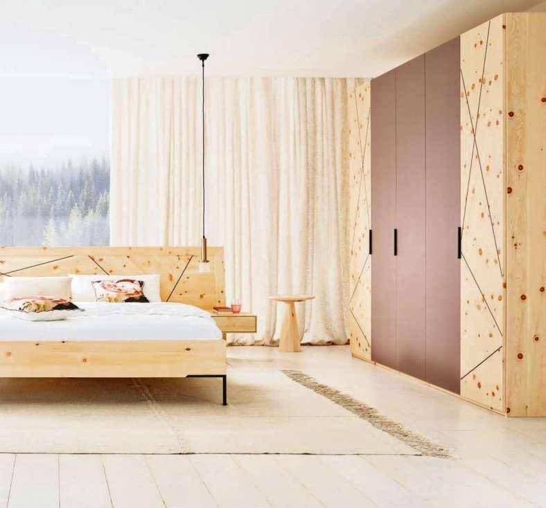 leno Schlafzimmer in Zirbe natur geölt, Kopfhaupt massiv, mit integrierten Nachtkästchen und vivo Beistelltischen, Schrank in Zirbe natur geölt, Glasfronten lackiert in beere 6669,ntage
