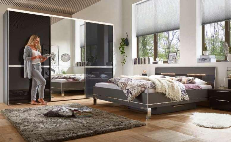 Schwebetürenschrank, Korpus in Dekor vulkan, Außentüren in Anthrazitglas, Mitteltüre in Kristallspiegel Griff- und Zierleisten chromfarbig, BHT ca 280x222x68 cm