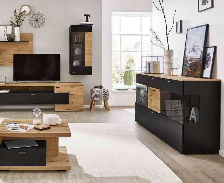 1| Interliving Wohnzimmer Serie 2107Wohnkombination – best aus Lowboard, Wandboard mit Ablageboden, Hängeelement und Hängevitrine