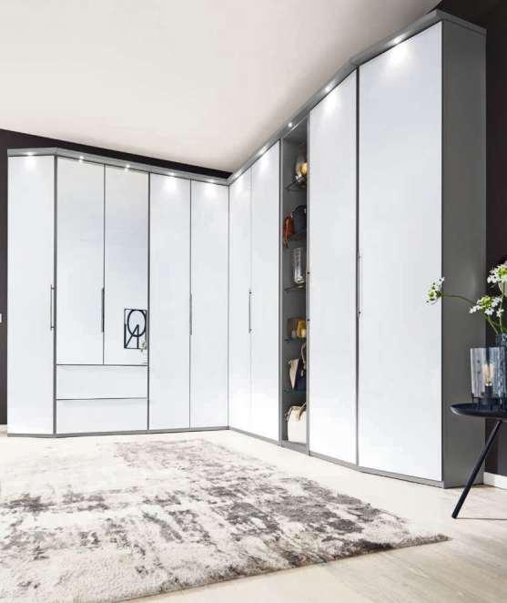 • Qualitativ hochwertiges Schranksystem bestehend aus Drehtüren-, Falttüren- und Schwebetürenschränken sowie 4 Eckschranklösungen.