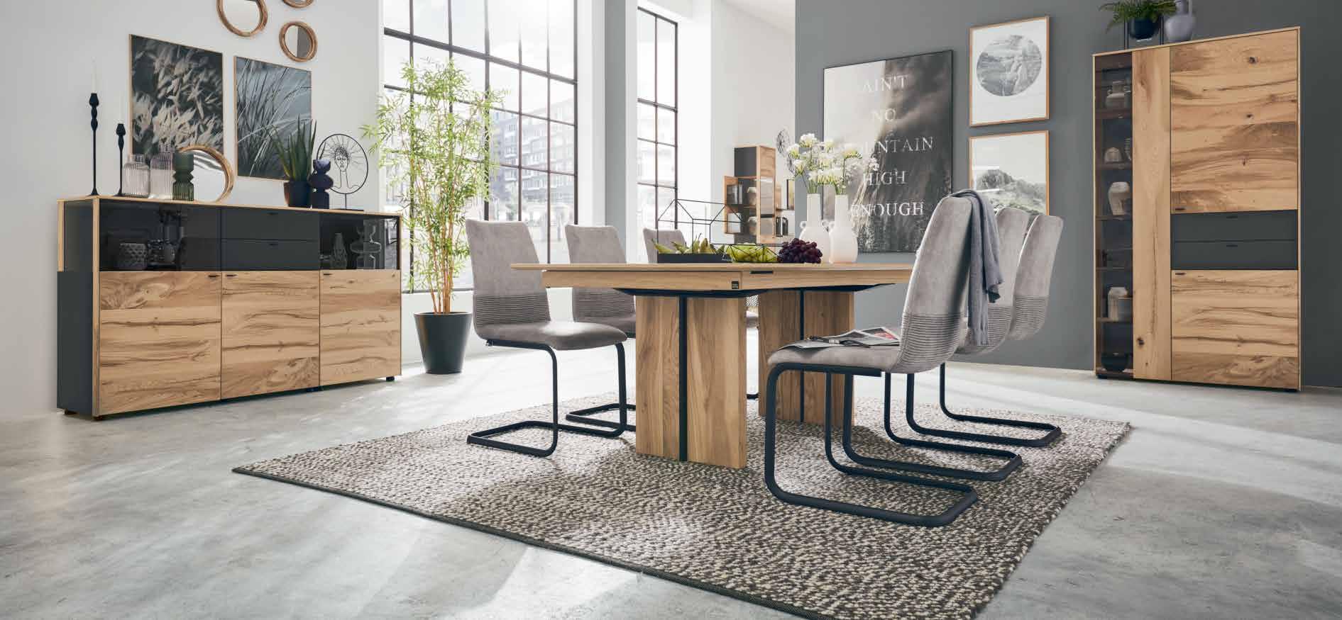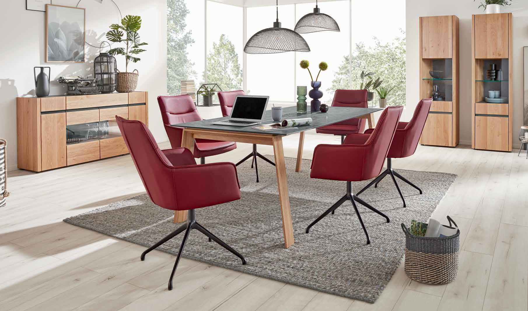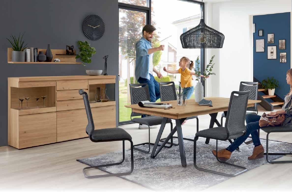 RU43_22_18-SKP Hochwertige Qualität die ihresgleichen sucht. Beste Verarbeitung und intelligente Funktionen machen aus unseren ebenso schicken wie stabilen Interliving Möbeln langlebige Begleiter für Ihr Zuhause. Für mich ist Qualität auch Sicherheit für uns alle. 1649.4| Interliving Esszimmer Serie 5604 - Esstisch 1779.3| Interliving Esszimmer Serie 5604 - Esstisch 2799.1| Interliving Esszimmer Serie 5111 - Esstisch 5| Interliving Esszimmer Serie 5604 - Schwingstuhl je 339.6| Interliving Esszimmer Serie 5604 - Vitrine 2579.Interliving Esszimmer Serie 5604, Front und Korpus Eiche rustico hell geölt, Absetzung Eiche anthrazit matt, Parsolglas grau. Ohne Deko. 3| Sideboard, ca. B182/H105/T43 cm. 4| Esstisch, ca. 190x 100 cm. 5| Schwingstuhl, Bezug Dubai stone, Gestell Metall anthrazit, Bezug: 100% Polyester. 6| Vitrine, ca. B102/H207/T43 cm. 666219-223 Interliving Esszimmer Serie 5603, Front und Korpus Wildeiche massiv, Oberböden, Applikationen und sichtbare Rückwände in Melamin Oxyde graphit. 7| Anrichte, ca. B158/H83/T42 cm. 8| Design-Tisch, Tischplatte HPL Oxyde graphit, Gestell Wildeiche massiv, ca. 200x100 cm. i26008 9| Design-Schalensessel, Bezug Leder Florenz burgundrot, Gestell Stativ, Eisen schwarz, ca. B64/H61/T89 cm. 10| Vitrine, ca. B53/H197/T42 cm. i26012