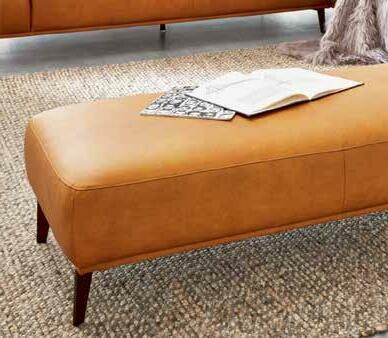 Bezug Stoff Deluxe zimt mit beigefarbener Kontrastnaht, Metallfuß alufarbig, best. aus: Canapé mit Armteil links, 2-Sitzer ohne Armteile, Rücken Spannstoff, 1-Sitzer-Kombielement mit Anstellhocker rechts. Stellmaß ca. 173x290x203 cm.