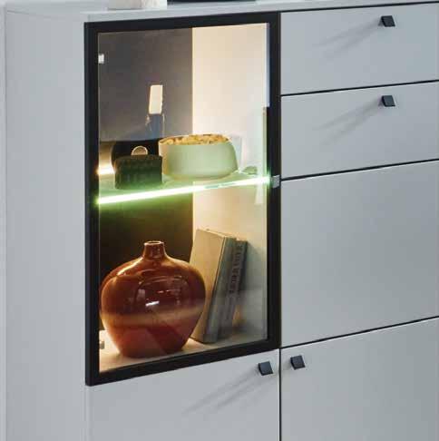 WOHN- UND SPEISEZIMMER-PROGRAMM, Front und Korpus Lack pastellgrau, Glasrahmen und Gestell schwarz.