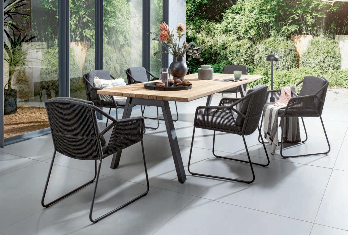 anthrazit, 100% Polypropylen. I52080/081 Dining-Stuhl, Edelstahlgestell anthrazit, Rope anthrazit, B/H/T ca. 64/83/62 cm, inkl. Kissen mit Olefin-Bezug, anthrazit, 100% Polypropylen. I52007/008 Esstisch, Edelstahlgestell anthrazit, Tischplatte Teakholz, B/T/H ca. 240/100/71 cm. I52078 1699.299.3. Couchtisch