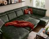 Eckkombination, Bezug oliv, Stoffgruppe 3, 100% Polyester, Sitzfläche Kaltschaum auf dauerelastischen Wellenfedern, Füße Metall schwarz, Schenkelmaß ca 323x222 cm, inkl 5x Kopfteilverstellung, ohne Dekokissen und Plaid 107069
