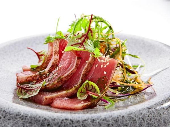 Mit Sojasauce, Sesamöl, Salz und Pfeffer eine Marinade nach eigenem Gusto vorbereiten. Den Thunfisch mit etwas Sesamöl sehr kurz und scharf von allen Seiten anbraten. In ca. 0,5 cm dicke Streifen schneiden und auf den vier Tellern verteilen. Mit Sesam, der Marinade und frisch geriebener Zitronenschale garnieren und genießen.
