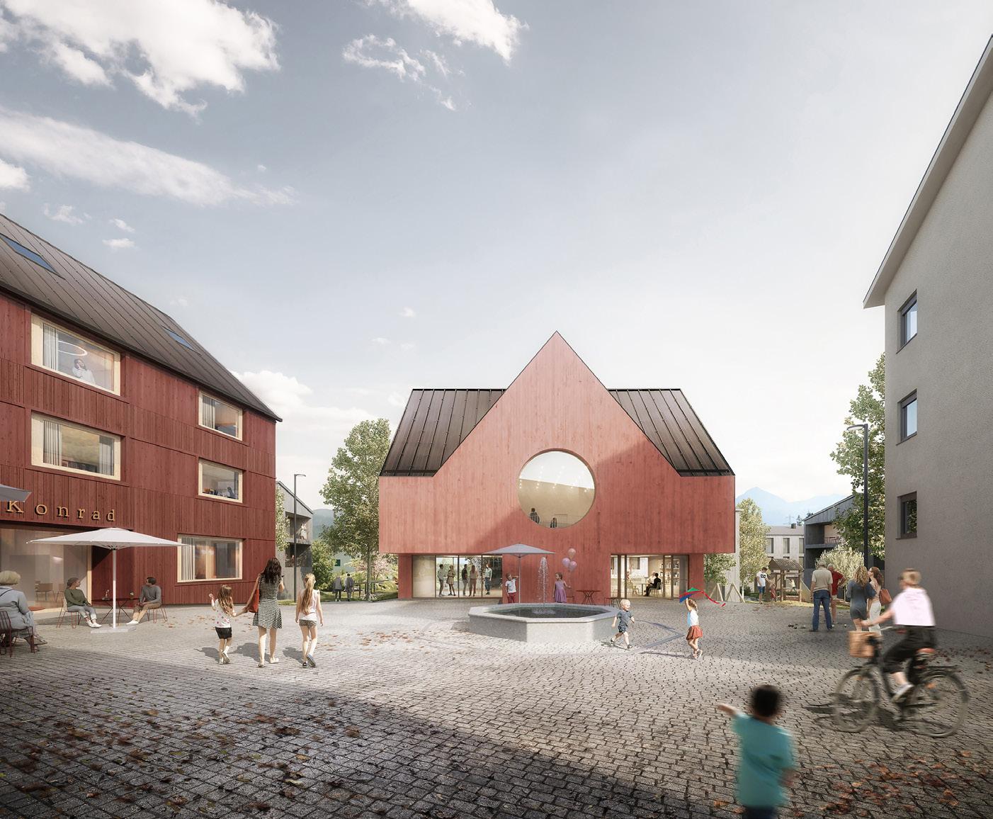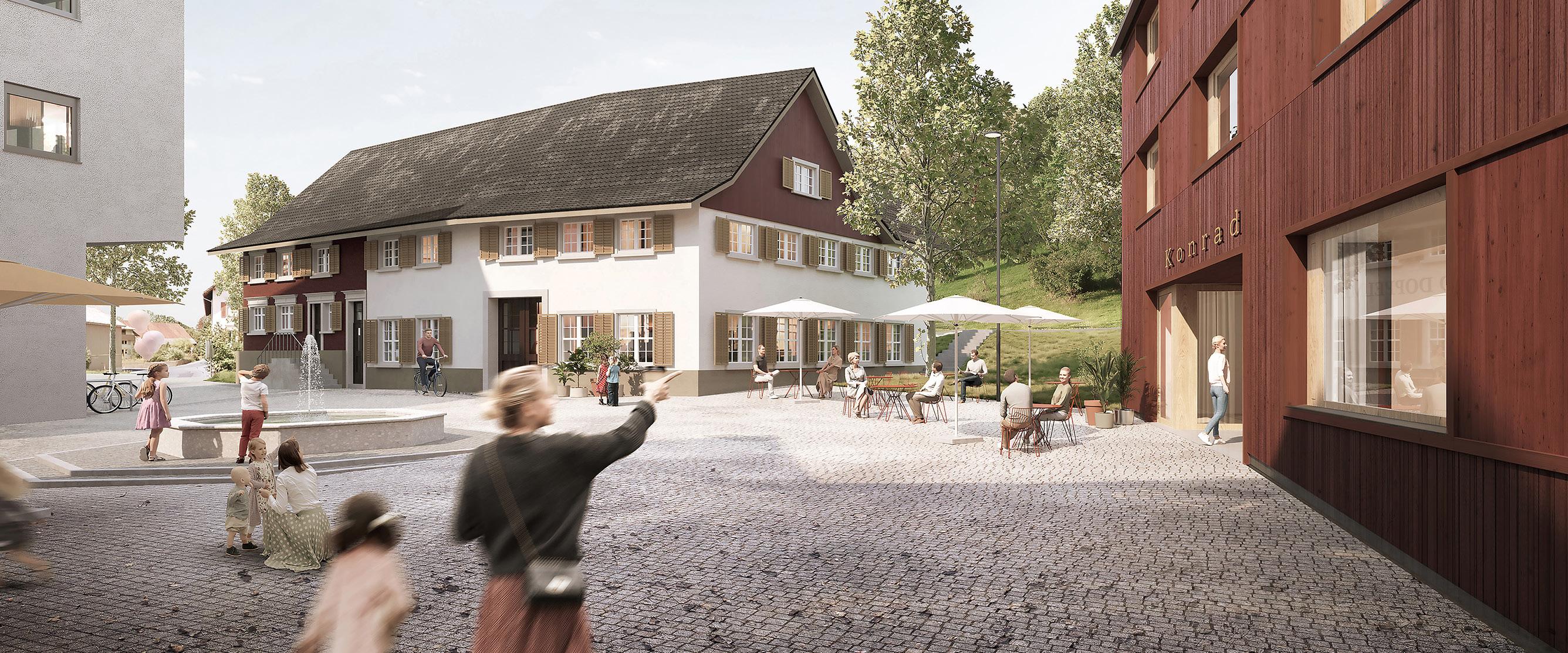 Als Herzstück des neuen Quartiers ist das Gasthaus „Konrad“ vorgesehen, das Gastronomie und Beherbergung vereint. Geplant sind ein lichtdurchfluteter Gastraum mit Außenplätzen am zentralen Platz des Quartiers sowie zwölf Hotelzimmer mit insgesamt 24 Betten.