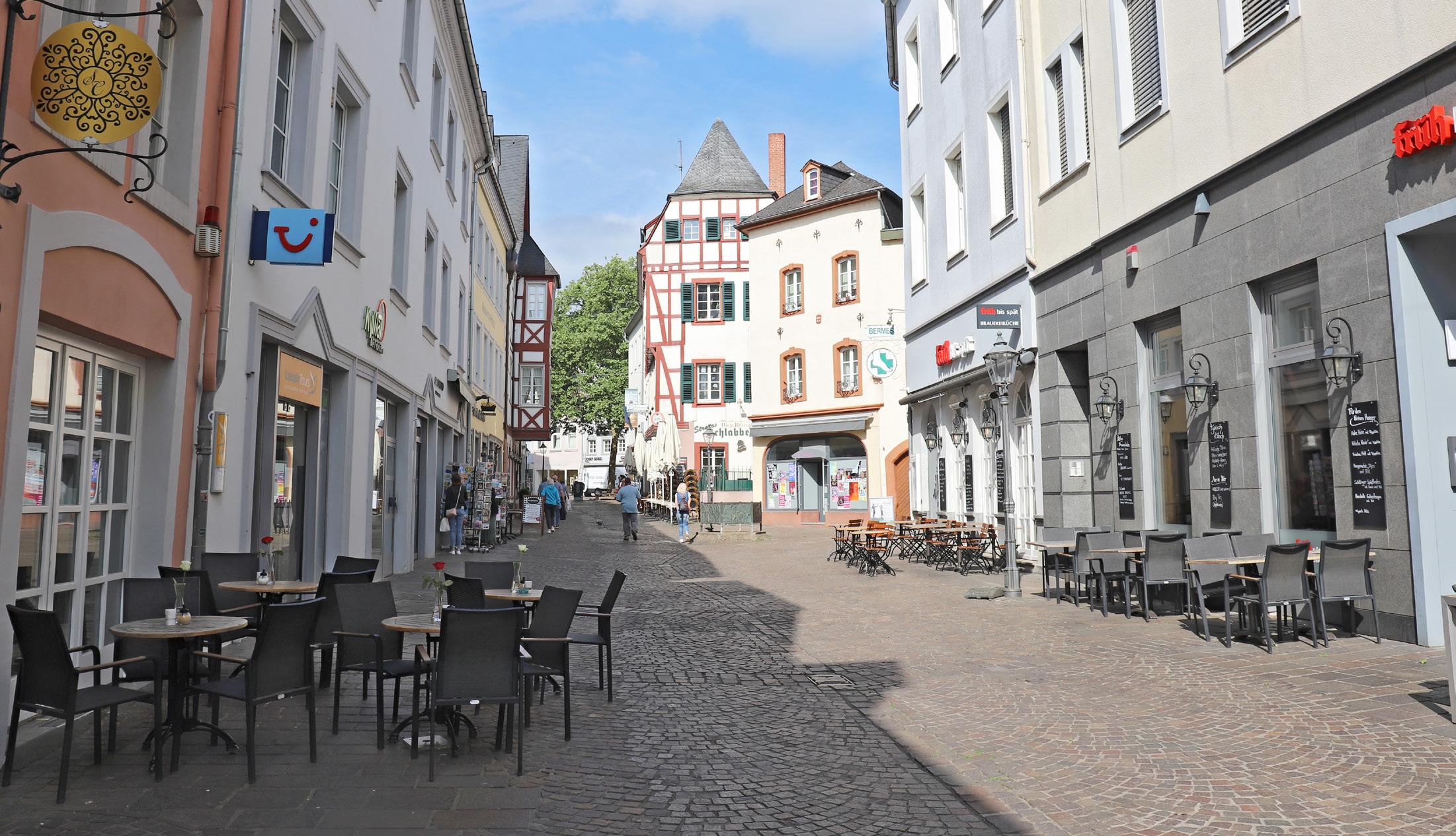 kerl auf die Gäste. Hier hat sich in den letzten Jahren viel getan. Ein großes Angebot an Restaurants lädt zur Einkehr und zum Genuss ein. In der kalten Jahreszeit kann man die gemütlichen Innenräume der Restaurants genießen. Im Sommer stehen viele Tische draußen im Schatten und laden Gäste ein Zeit in dieser urigen und typisch trierischen Straße zu verbringen.