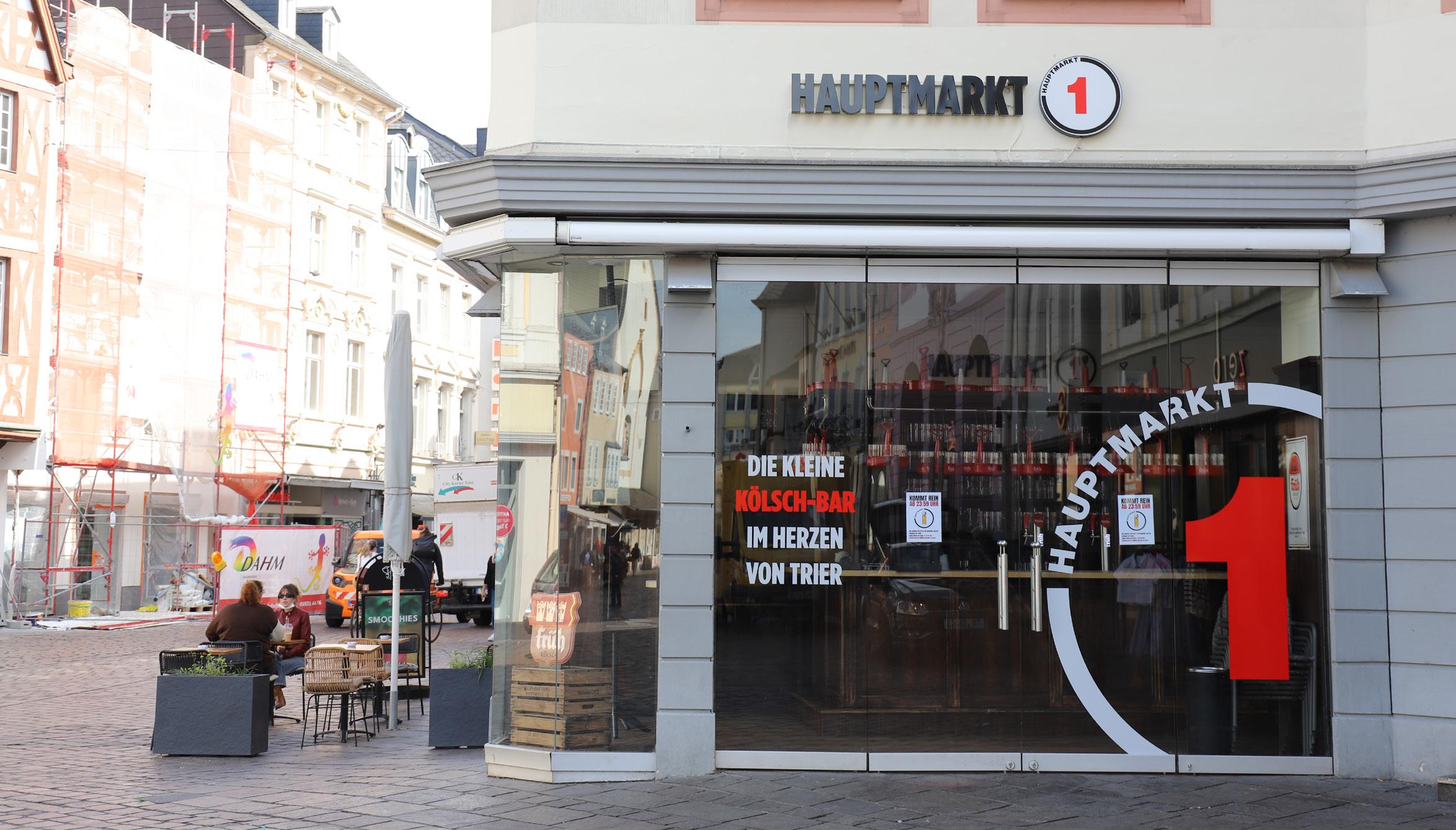 den Stehmöglichkeiten draußen und im Lokal selbst auch einige Sitzmöglichkeiten, wenn man es sich direkt an der Theke gemütlich machen möchte. Die Betreiber des Lokals sind in Trier keine Unbekannten, ihnen gehört auch das Früh bis spät in der Glockenstraße. Geöffnet hat die Hauptmarkt 1 ab sofort montags bis sonntags von 11 bis 23 Uhr.