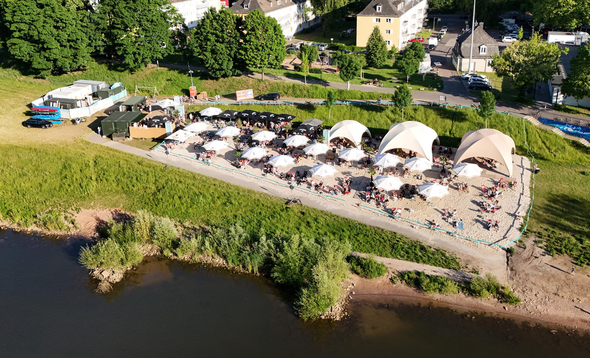 Schon im 6. Jahr genießt man in Trier die entspannte Strandatmosphäre am Moselufer. Der chillige Sandstrand befindet sich in TrierNord unterhalb des Nordbads und bietet neben einer Bar mit kühlen Drinks und einem Imbiss mit köstlichen Snacks auch einen StandupPaddle-Verleih und Kanuverleih. Neben einer Fläche von 3000 qm2 findet der Gast hier mehr als 300 Sitzgelegenheiten und Liegestühle vor, um den herrlichen Blick auf die Mosel und den Sandsteinfelsen zu genießen. Ein Musik- und Eventprogramm mit wechselnden DJ's rundet den Tag an der Moselperle ab. So gibt es jeden Donnerstag ab 17:00 Uhr eine After-Work-Party und sonntags ab 16:00 Uhr „Ein Tag am Strand“ mit chilligem beach house. Auch für Firmenfeiern von 50 bis 1500 Personen kann der Strand gemietet werden.