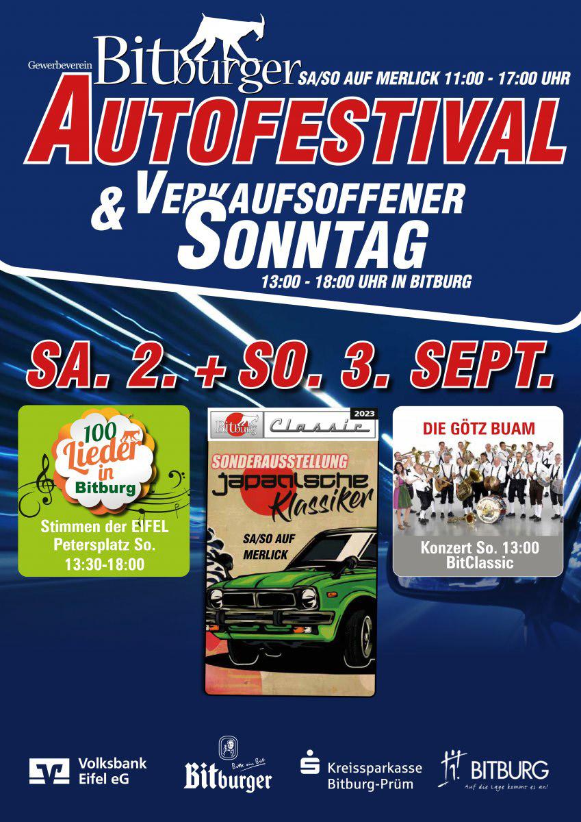 Die Autohändler und der Bitburger Einzelhandel in der Innenstadt laden gemeinsam zum verkaufsoffenen Sonntag ein. Schon auf dem Spittel präsentieren sich einige Fahrzeuge und machen Lust auf einen Besuch auf Merlick, dort planen die Autohändler zahlreiche Programmpunkte. Der leistungsstarke Bitburger Einzelhandel präsentiert sein Warenangebot den Sonntagsshoppern und natürlich gibt es im Rahmen des verkaufsoffenen Sonntags von 13.00 bis 18.00 Uhr auch eine kulinarische Entdeckungsreise.