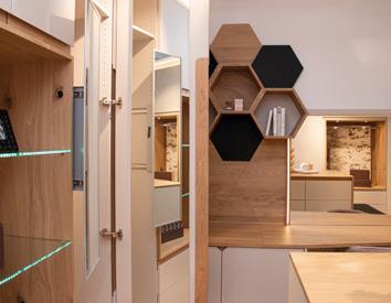 In der modernen, großen Schreinerei können Sonderanfertigungen aller Art und individuelle Lösungen realisiert werden. Aber nicht nur für den Küchenbereich sind die Schreiner tätig, erfahrene Meister und Gesellen verwirklichen maßgeschneiderte Einrichtungsgegenstände und kümmern sich zudem um Reparaturen und Änderungen aller Art. In der großen Schreinereiausstellung kann man sich Eindrücke von diversen Produkten und vielseitigen Tätigkeitsbereichen verschaffen. Von Haus- und Zimmertüren, Fenster, Treppen und Fußbodenbelägen bis hin zu individuell gefertigten Einbauschränken bietet das Team hochwertige Arrangements, die auf jede Art von Gegebenheiten und Bedürfnissen abgestimmt werden. Ob beispielsweise die zentimetergenaue Anpassung von Möbeln an Dachschrägen oder die komplett individuell geplante Innenarchitektur - die Schreinereiabteilung macht es möglich.