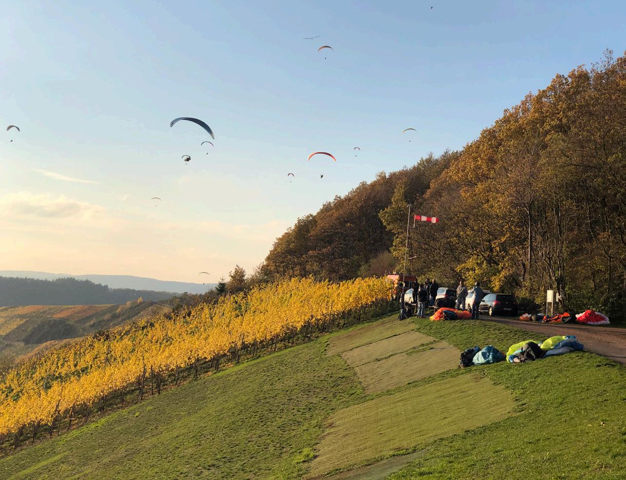 Startpunkt für den Seitensprung Klüsserather Sagenweg ist das Portal am Parkplatz an der Wetterstation. Egal wie das Portal mit der Liegebank und der Infotafel zur Sage vom Kreuzritter erreicht wurde (mit dem Pkw oder über den ca. 2,5 km langen Zuweg durch die Weinberge), das Panorama von hier ist atemberaubend. Die ganze Moselschleife von Klüsserath ist zu überblicken. Ein Meer von Weinreben, die Häuser am blauen Band der Mosel aufgereiht. Ein grandioser Auftakt für eine abwechslungsreiche Rundtour zu allen Jahreszeiten. Auf dem ersten Stück kommt man entspannt und höhengleich am Wald- und Weinbergsrand am Startplatz der Gleitschirmflieger vorbei. Es ist entschleunigend den Luftsportlern beim Tanz mit den Winden zuzusehen.