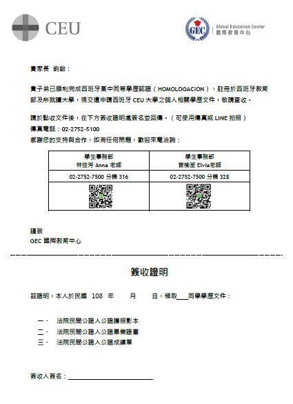 西班牙教育部註冊同等學歷認證皆已順利通過 審核,將歸還 2022 及 2023 年入學同學之高中 畢業文件正本,請家長們查收並回傳簽收證明 給台北辦公室。